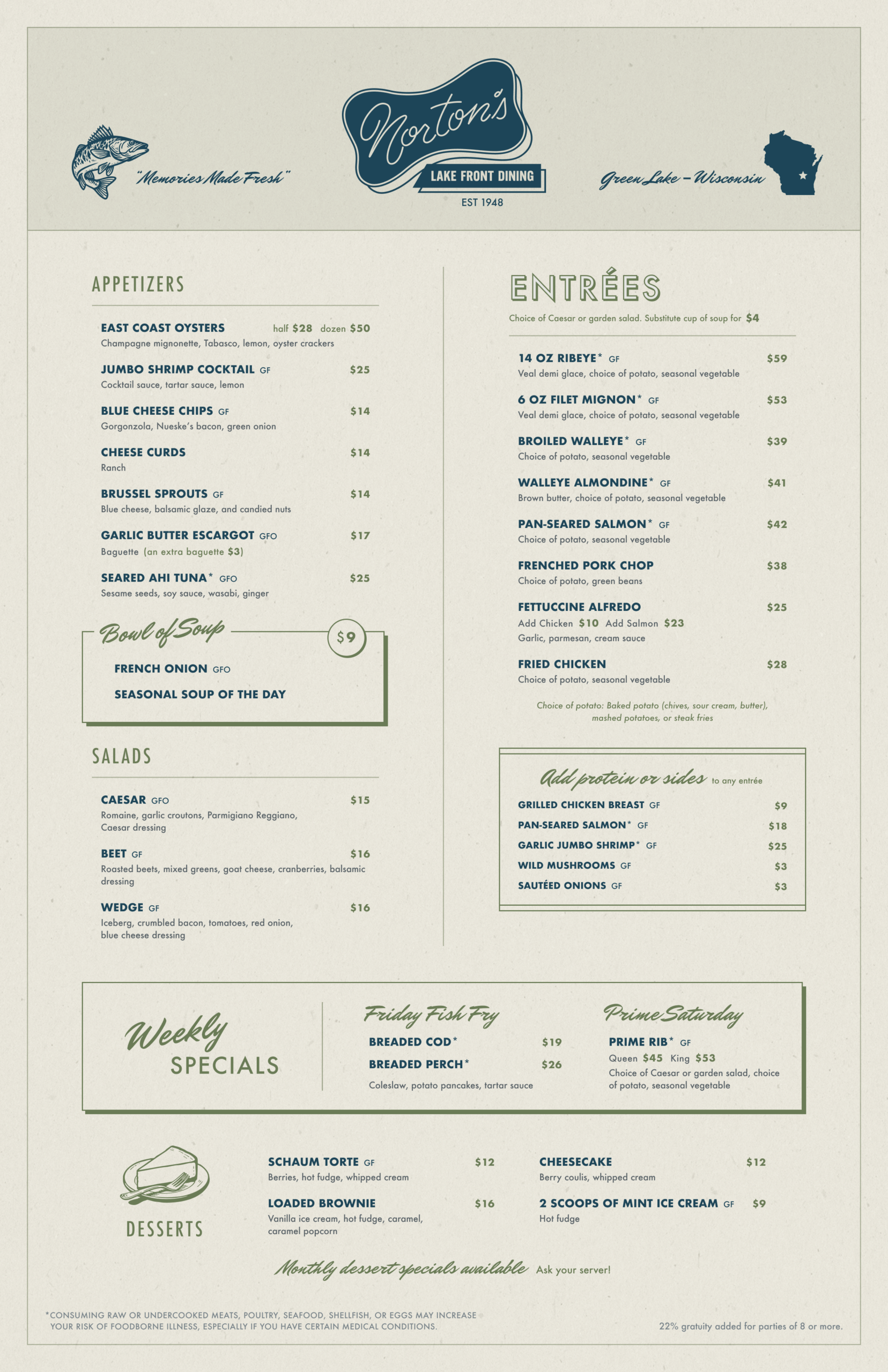 Established in 1948, Norton’s of Green Lake is a beloved supper club where families have been gathering for generations. We’re more than just a restaurant—we’re a community tradition steeped in nostalgia, where neighbors become friends and every meal feels like coming home. Join us for great food, friendly faces, and the kind of memories that last a lifetime, all set against the beautiful backdrop of our vibrant lakefront.