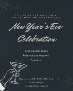 New Year’s Eve at Norton’s. The countdown is on, and we’re celebrating two ways. Start your evening with our reservation-only dinner service, and stay for our after-party from 9PM to midnight, complete with dancing, toasts, and a proper welcome to 2026.